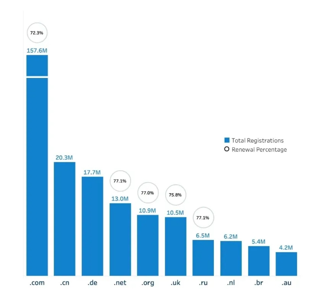 截至2024年第二季度末,全球頂級域名注冊量為3.624億。.com和.net域名注冊總數(shù)為1.706 億,.com域名庫共計 1.576 億個域名注冊,.net 域名庫共計 1300 萬個域名注冊。