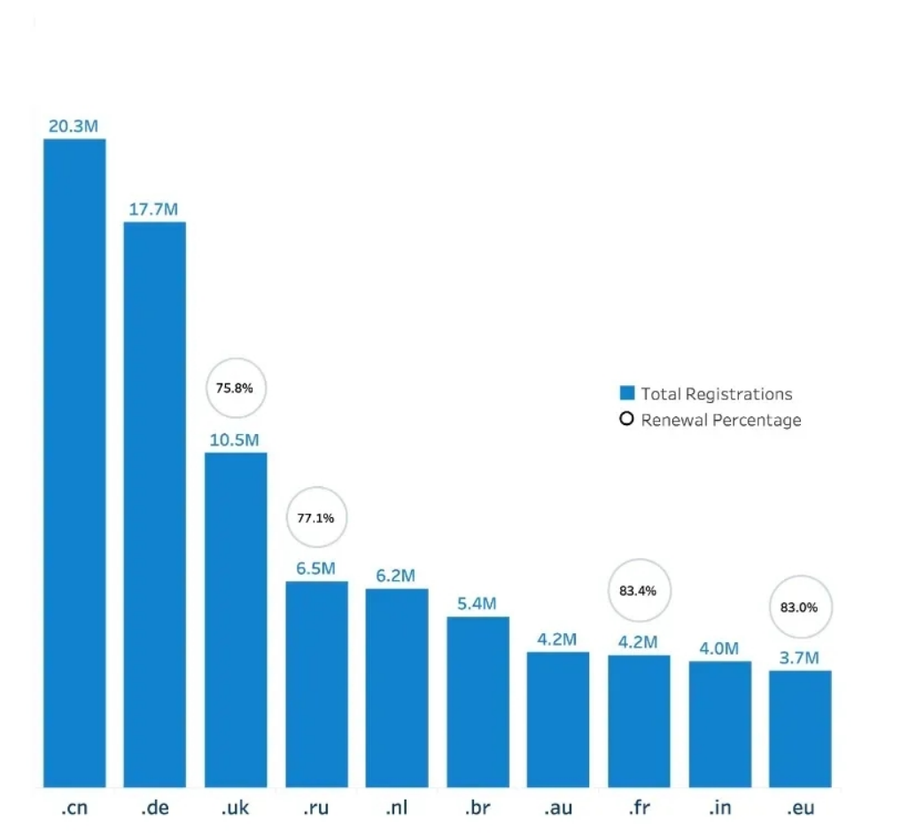 截至2024年6月30日,按報告排名注冊量排名前 10 位的ccTLD(國家及地區(qū)頂級域名) 分別是: